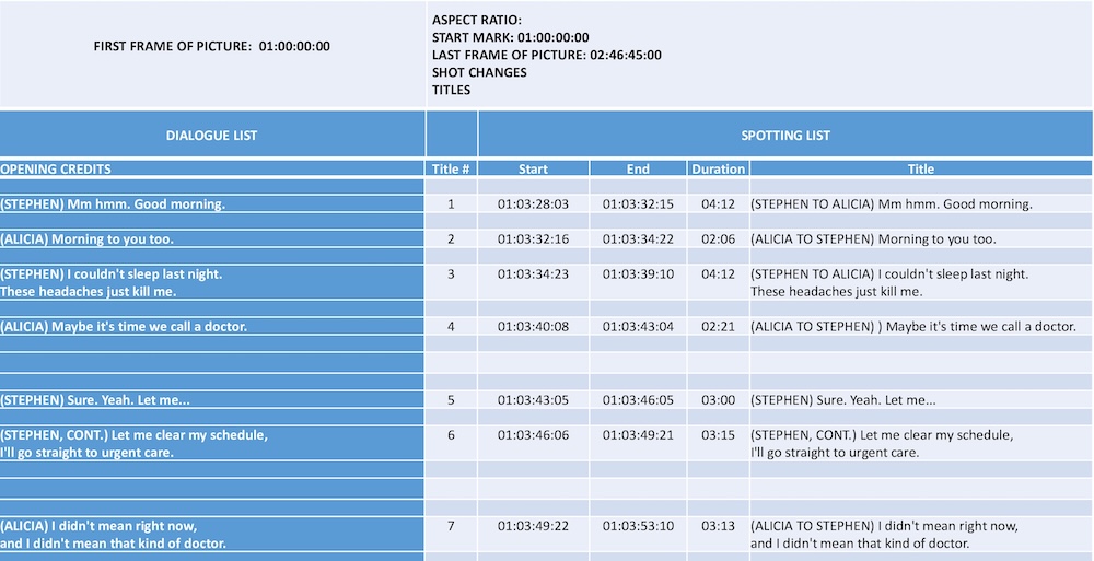 Elaboración precisa de listas de diálogo, tiempos, personajes y descripciones técnicas para productoras, cadenas y plataformas que necesitan un control exacto del contenido audiovisual.